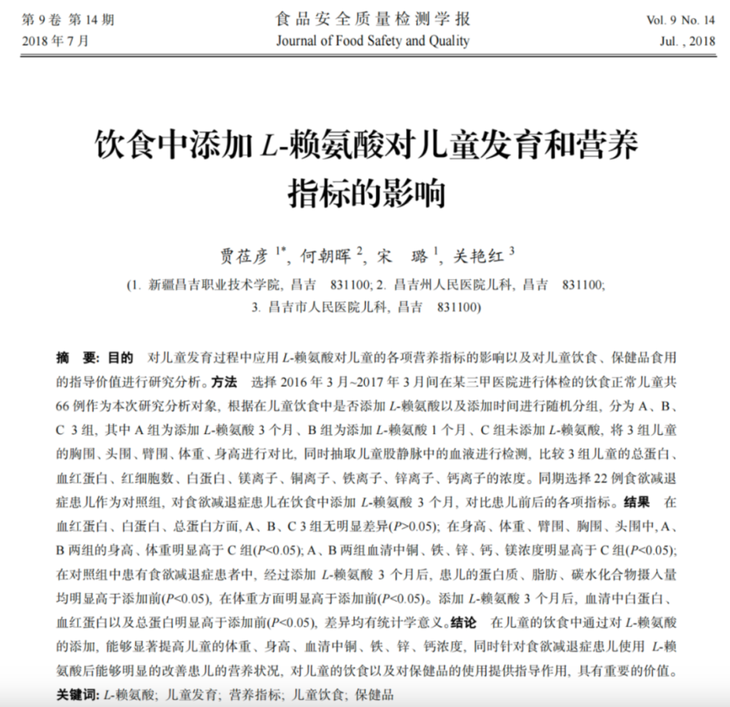 赖氨酸是人体必須氨基酸之一,它能参与骨骼肌、酶、血清蛋白、多肽激素等多种蛋白质等合成,促進矿物质的吸收和骨骼生长。