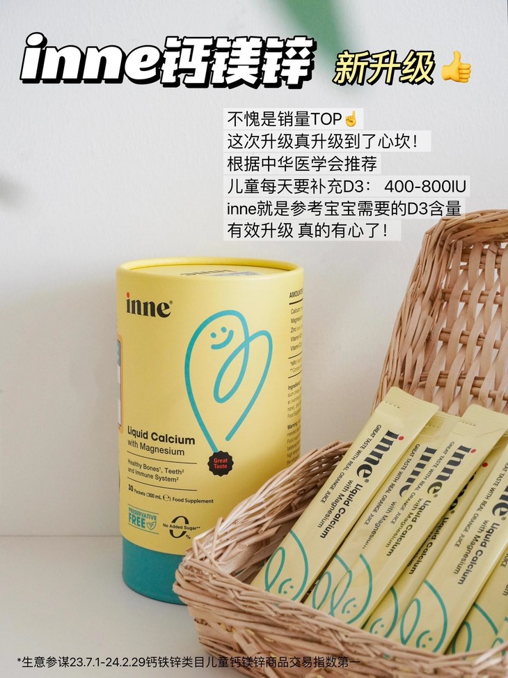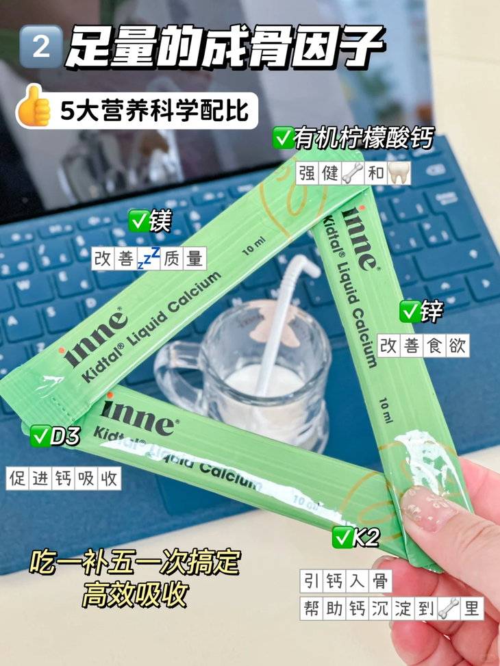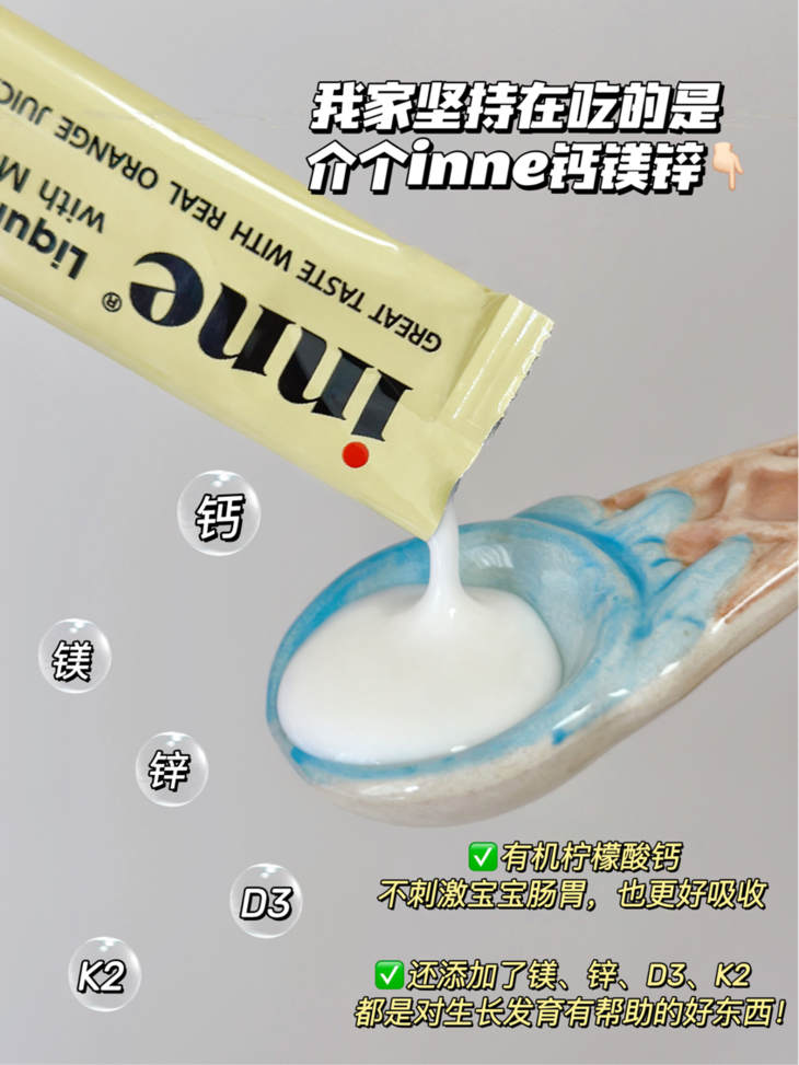 inne 把所有的元素都给大家找齐了!柠檬酸钙 + 镁 + 锌 + D3 + K2,帮助娃凑齐了补钙所需的微量元素: