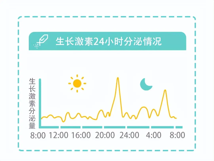 这样算下来,既要让孩子早点睡,最好10点前睡着,到11点左右能进入深睡眠状态,让生长激素的分泌达到理想的峰值。