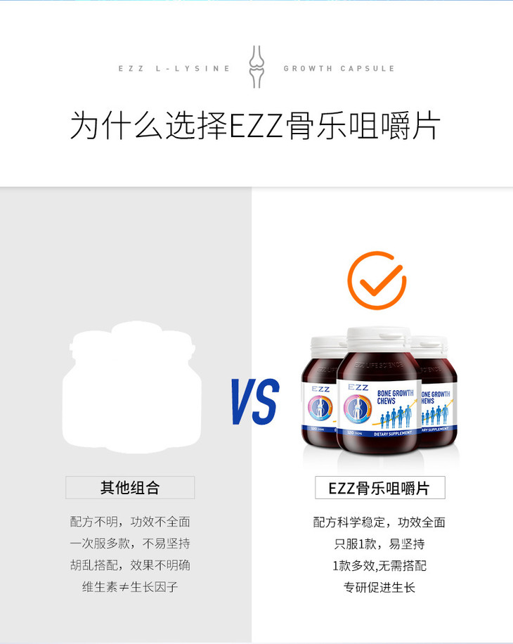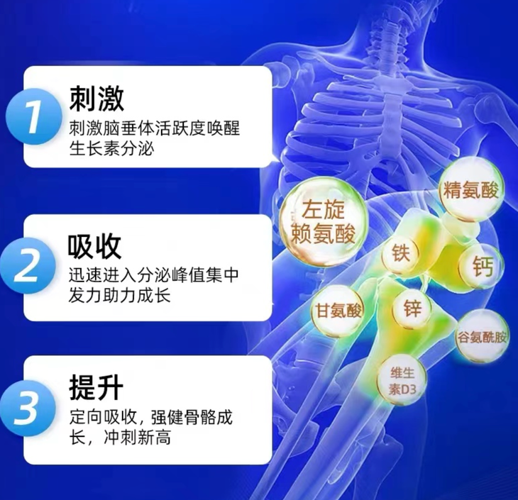 EZZ成长系列是由多种成长因子科学配比,通过左旋赖氨酸搭配谷氨酸、甘氨酸进行刺激,再通过低聚果糖、维生素D3等促進吸收,搭配钙镁锌等进行提升,多維度协作,助力成长。