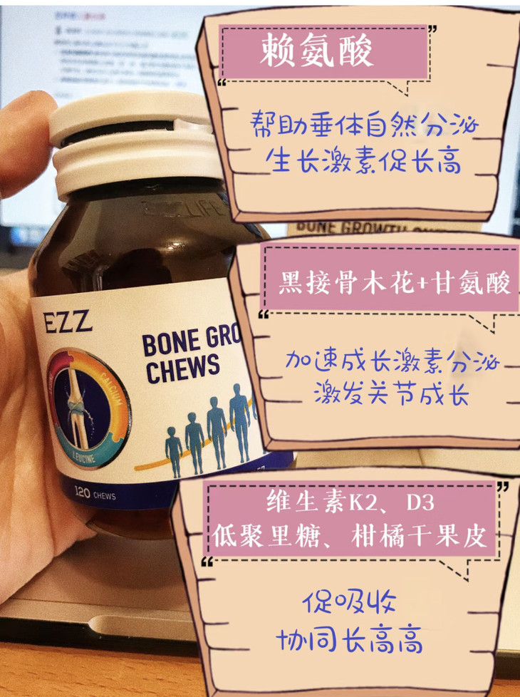 相比市面上仅50+mg的含量,EZZ成长丸里提取了唯一符合人体吸收补充的高浓赖氨酸,每一粒能达到80mg左旋赖氨酸(L-Lysine),高纯高活促进脑垂体活跃分泌生长激素。