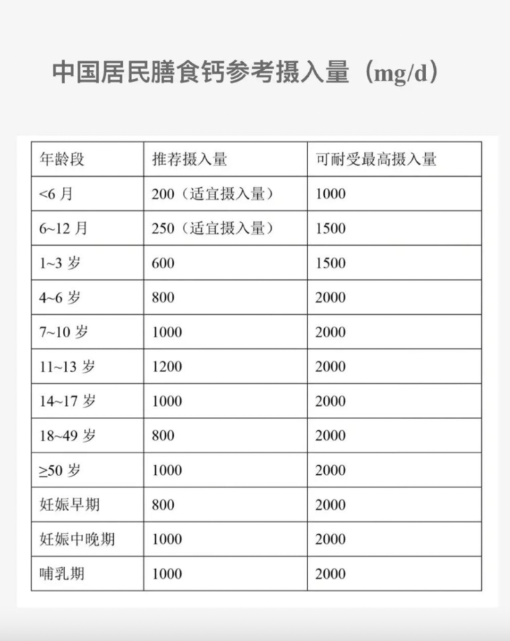 关于饮食方面的营养,相信大家都知道要补钙!那孩子在不同年龄的生长阶段到底需要多少钙呢?这里我也整理了中国居民膳食钙参考摄入量给大家参考: