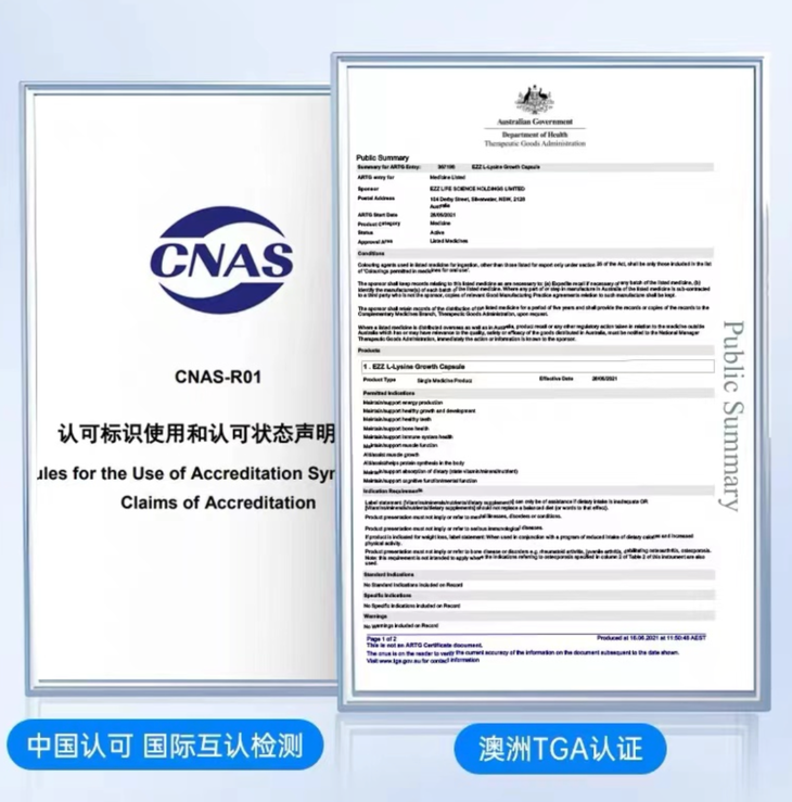 EZZ首创复合配方赖氨酸成长丸,每颗赖氨酸含量是80mg,并搭配13种成长营养素,科学配比,获得了药品生产标准金字塔顶端TGA认证(品质标杆严格程度超过美国FDA)!