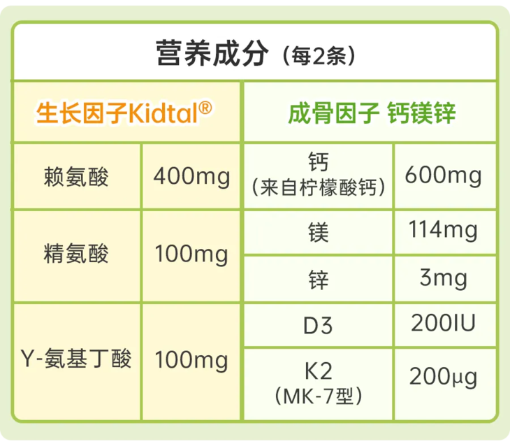 其次,并不是说只要补充了赖氨酸=长高,赖氨酸只是一种必不可少的营养元素,产品也是科学配比了钙、镁、锌、VD、vk2多种助力孩子生长的营养元素综合补充孩子所需的营养。