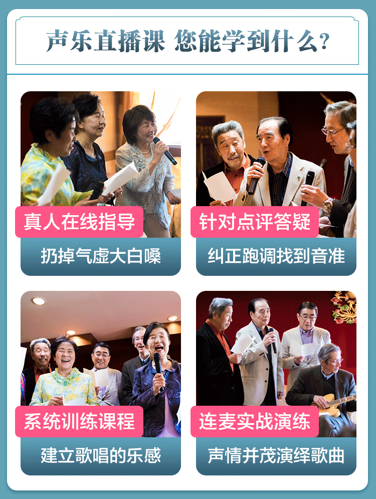 本课程专门针对中老年朋友,教学细致认真,只要有一部智能手机,零基础也能轻松学!经过6天课程和老师的专业指导,帮您扔掉气虚大白嗓。