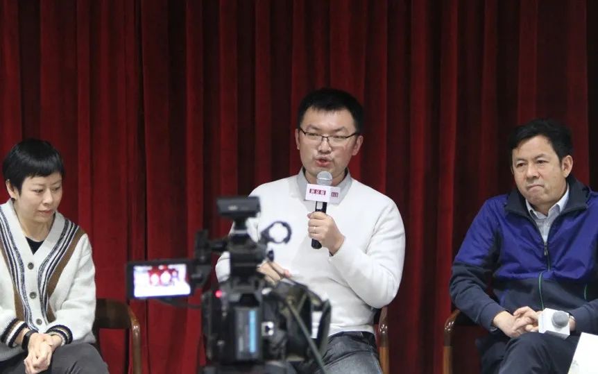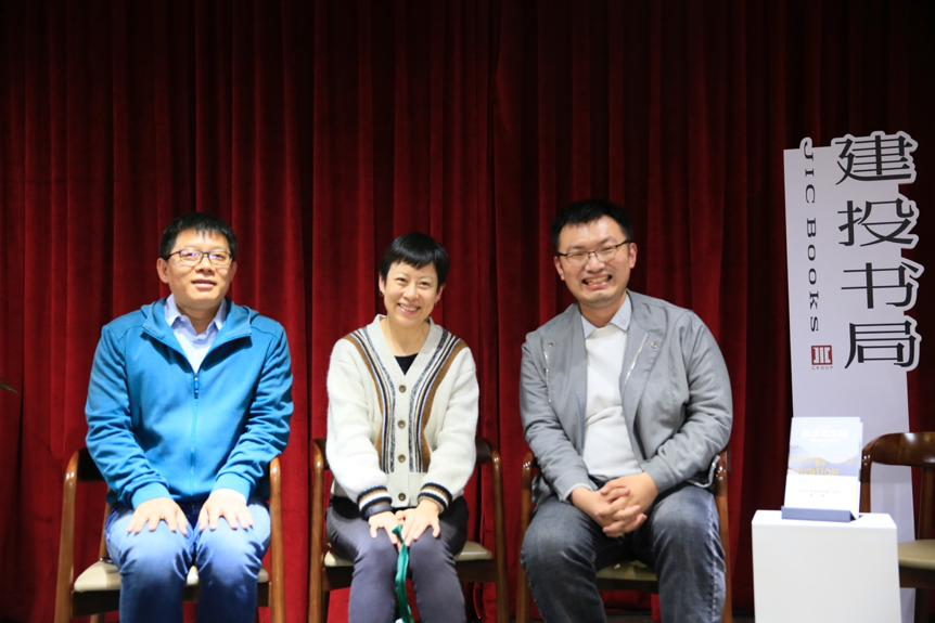 活动现场,从左到右,范新(主持人)、刘瑜、张笑宇。