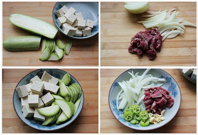 1、将豆腐切块,西葫芦切片,青红椒切丝,洋葱切片;