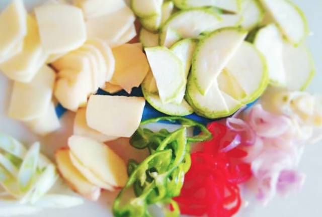 淘米水,青红椒,西葫芦,洋葱,盐,豆油;