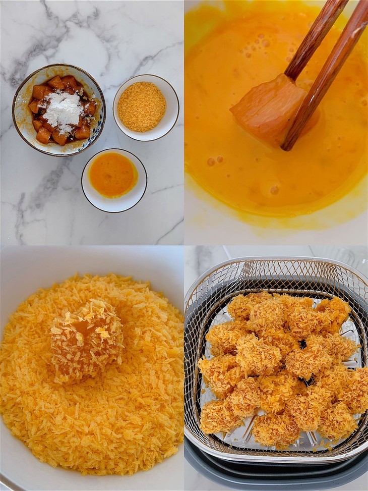 再裹上一层淀粉、一层蛋液、一层面包糠。