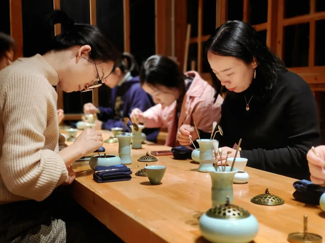 在完成了打香篆的步骤之后,点上香,我们开始聆听古琴演奏。那里的夜晚真静啊,仿佛天地之间只有这一间小小的屋子,古琴的声音明明在耳边,却好像是从天上流淌下来的,那一刻仿佛发生了时空交叠,既如此真实、如此当下,又好像穿越到了千百年前,跟一群士人朋友一起品香、听琴、感悟天地......我有点明白,我在课程里总会讲:"唐宋的香文化引领着全世界对香气的审美潮流......",以前讲到这句话的时候就像一个四五流的小演员念台词,努力装成情感丰沛的样子,在这一刻,我终于窥到一眼何谓"对香气的审美",以及在那个年代的人曾在香气中得到过怎样的精神体验。