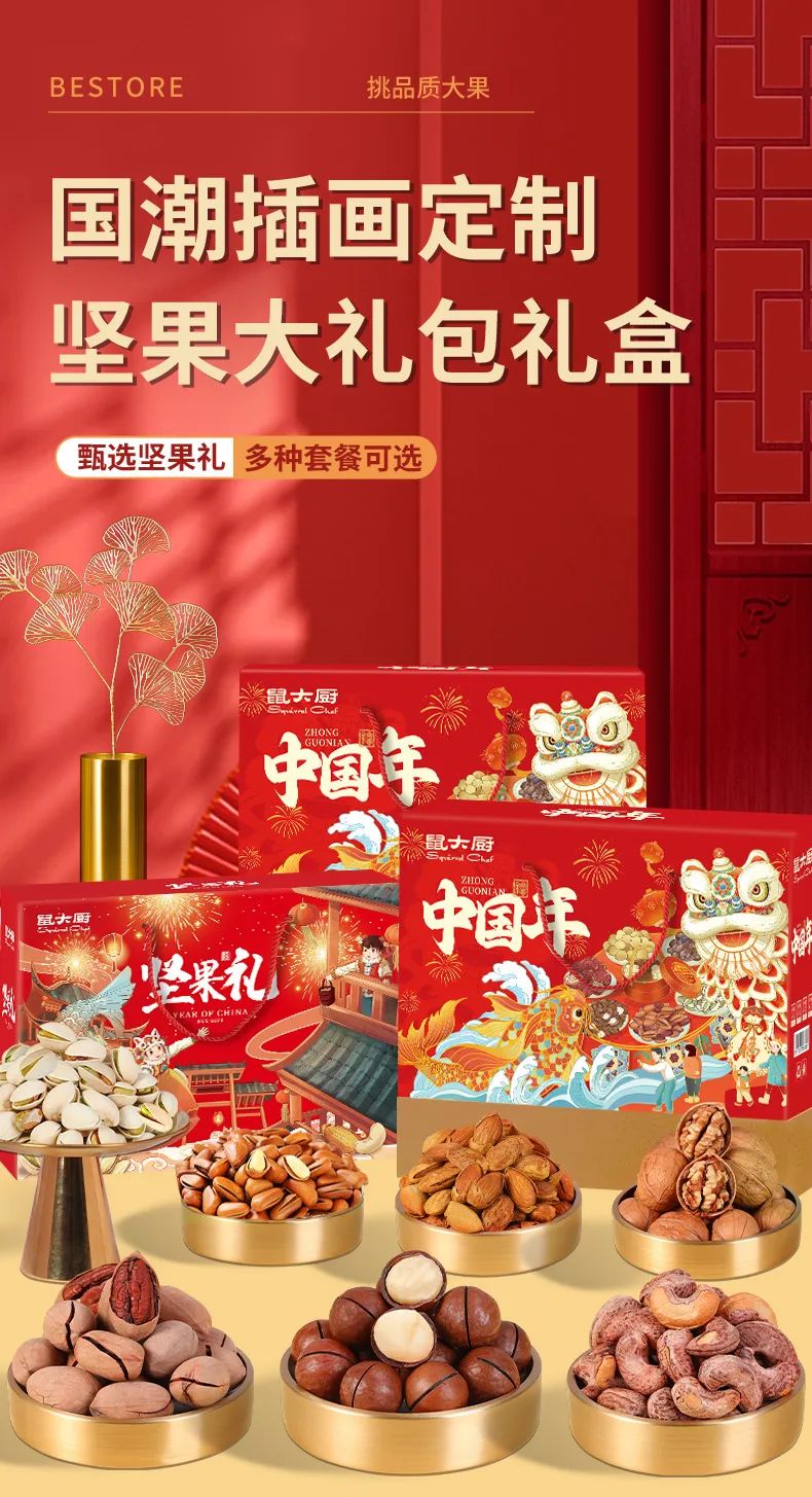 🌟更值得一提的是,坚果富含丰富的营养成分,是健康与美味的完美结合👍。其中含有优质蛋白质,为身体提供能量和营养支持;膳食纤维有助于促进肠道蠕动,预防便秘;各种维生素和矿物质,如维生素 E、锌、镁等,对身体健康也有着重要的作用💪。过年期间,大家难免会吃一些油腻的食物,这时来上一把坚果,既能解腻,又能补充营养,简直是一举两得呀🤩。🎈作为年货送人,这款坚果礼盒更是不二之选💕。它不仅外观精美,内容丰富,还寓意着美好和祝福。将它送给长辈,表达对他们的敬重和关爱,祝愿他们身体健康;送给亲朋好友,传递浓浓的情谊,希望大家新的一年幸福美满;送给同事客户,展现你的用心和诚意,助力事业更上一层楼🎉。这款国潮插画坚果礼盒,以其买一送一的优惠活动、精美的包装、丰富的坚果种类和高营养价值,成为了今年过年送礼的绝佳选择😍。宝子们,赶紧囤起来吧,让它为你的新年增添一份别样的温暖和喜悦🎉。