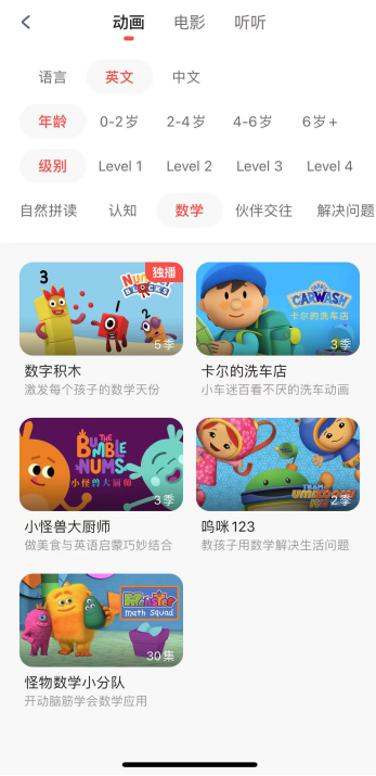 比如想让孩子学数学,就可以筛选“数学”,除了小小优趣独播的《数字积木》之外,系统还会推荐《乌咪123》、《怪物数学小分队》等等适合数学的内容!