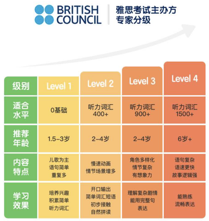而且小小优趣不只是有优质资源,他们的分级既权威又实用,小小优趣和雅思考试主办方British Council、北京外国语大学曹文教授,依据动画片语言难度、情节复杂程度对小小优趣的全部内容做了专业分级,将看动画+有效英语启蒙做到极致。