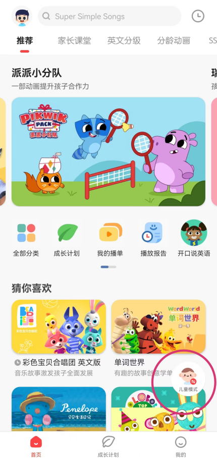 (儿童模式点击首页右上角图标即可进入家长模式)