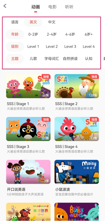 而中文动画是按年龄分级的,小小优趣参考了《3-6岁儿童学习与发展指南》以及美国PBS分龄发展体系,对中文动画做了4个年龄段的分级。
