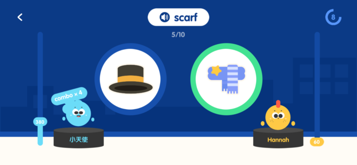 还有最新上线的词汇PK赛,宝贝不仅可以和小小优趣的小伙伴进行双人PK赛!还可以通过多人对战赛与20个小伙伴一起竞技,学习氛围感满满的!通过这种在玩中学的方式,宝贝可以在轻松快乐的状态下,实现巩固记忆单词的目的。这里再悄悄告诉下大家,答题越快得分越高哦~