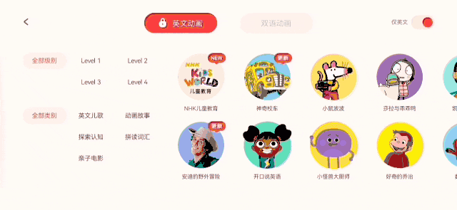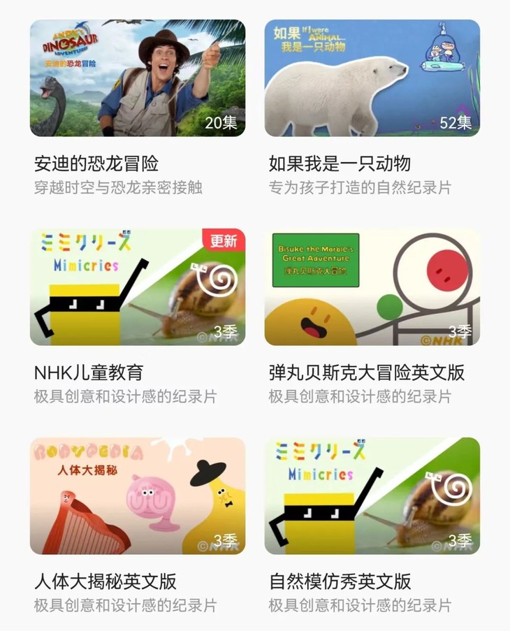 首先是内容越来越丰富了,从最开始的SSS儿歌,到后来陆续引进了数字积木、字母积木、小鼠波波、神奇校车等一大批优质内容,目前小小优趣平台上有8000+中英双语动画儿歌,甚至适合大龄孩子的纪录片和亲子电影也在陆续上新中,妥妥满足了孩子英语启蒙的需要。