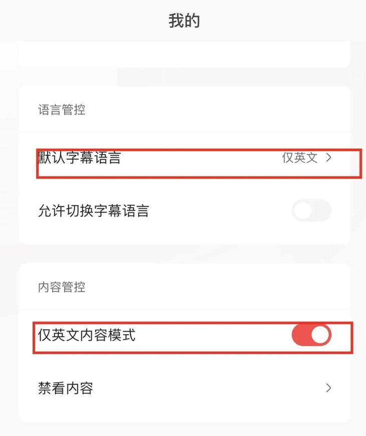 小小优趣多数动画片都是中英双语的,如果想更专注给孩子英语启蒙,点击“我的”,可设置“仅英文内容模式”,所有中文内容就都隐藏了,也可以把默认字幕设置为“仅英文”。