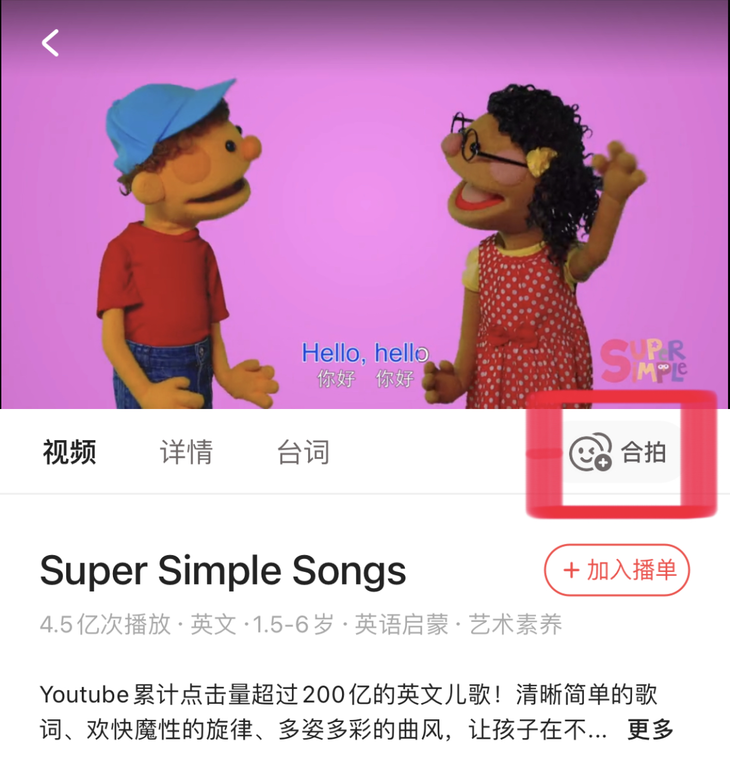 同期新上线的功能还有sss儿歌合拍。家长可以选择孩子喜欢或擅长的儿歌,点击“合拍”即可进入拍摄界面。这个功能不仅可以记录孩子快乐说英语的时光,还能检验孩子的学习成果~简直是一举两得!