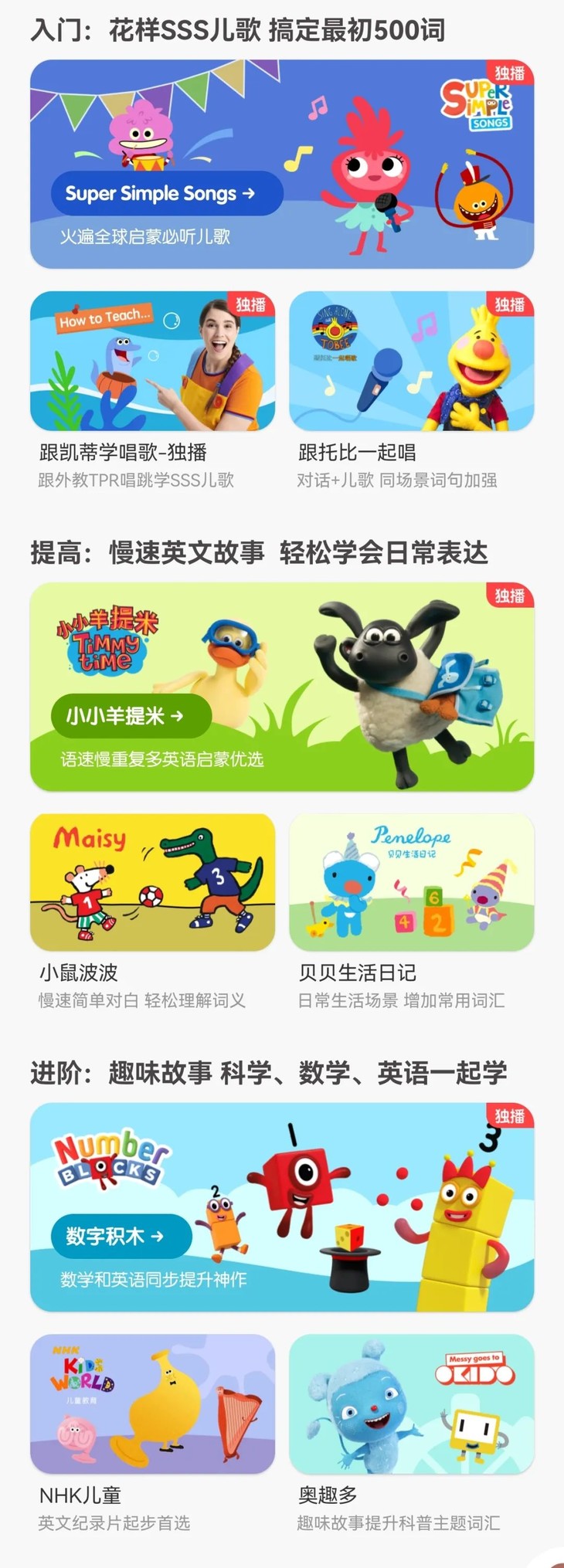 Level3:适合听力词汇900+孩子,这个级别的孩子已经能看懂大量情节丰富、剧情复杂的动画,对英语越来越信心了,重点推荐数字积木、儿歌童谣城、瑞奇宝宝等。