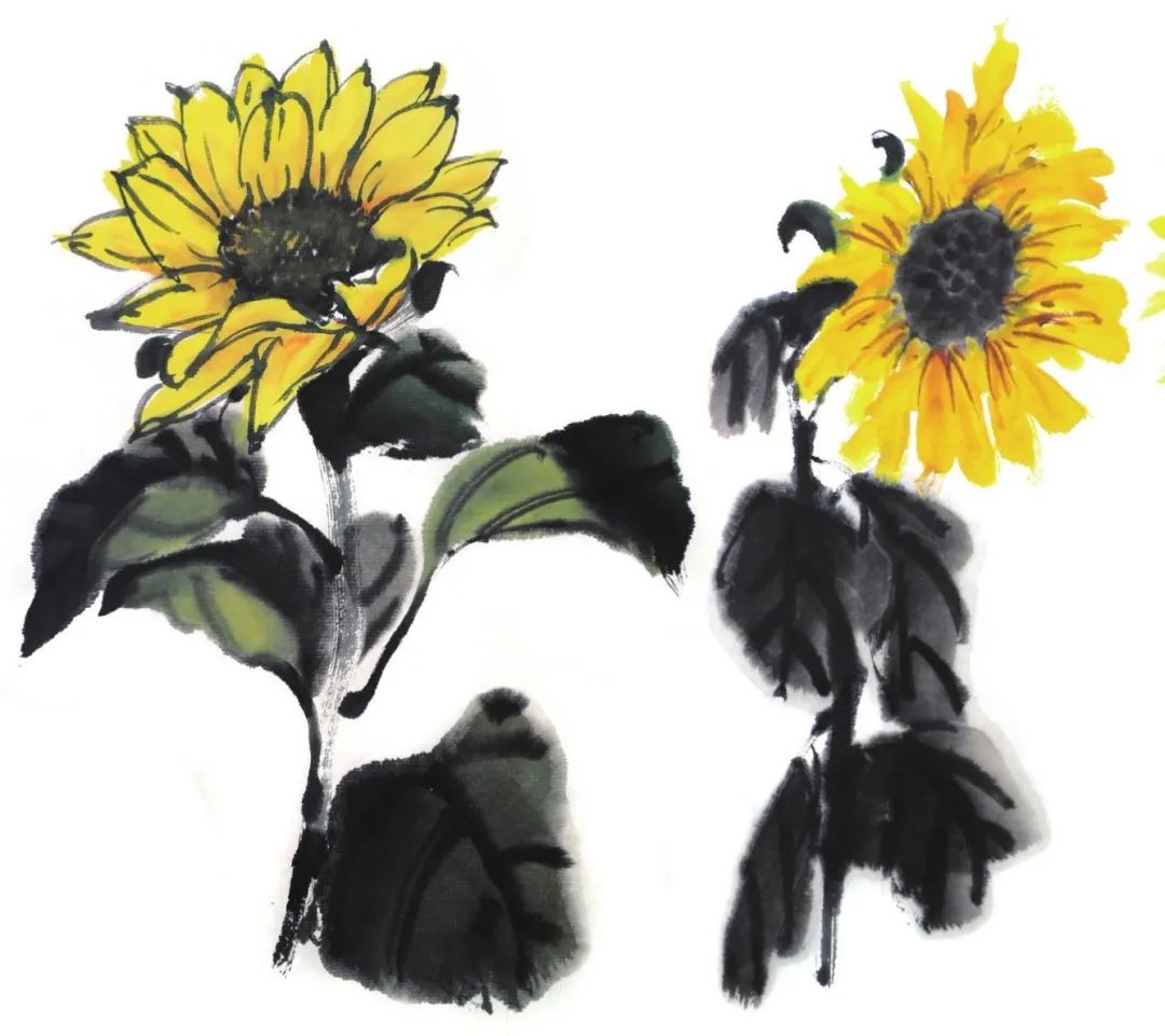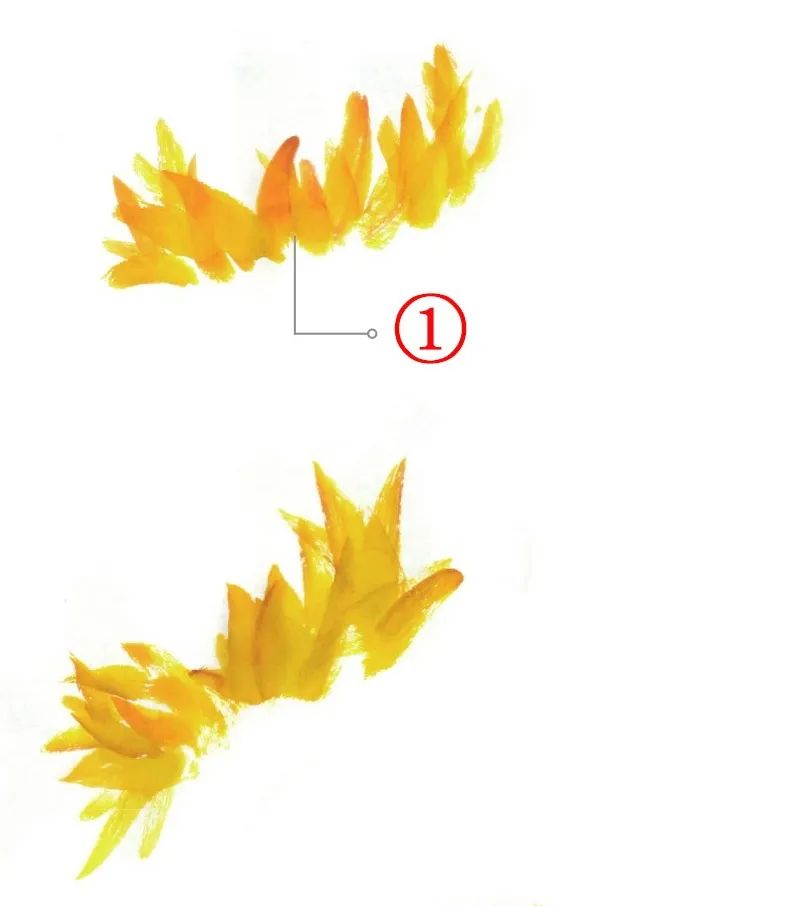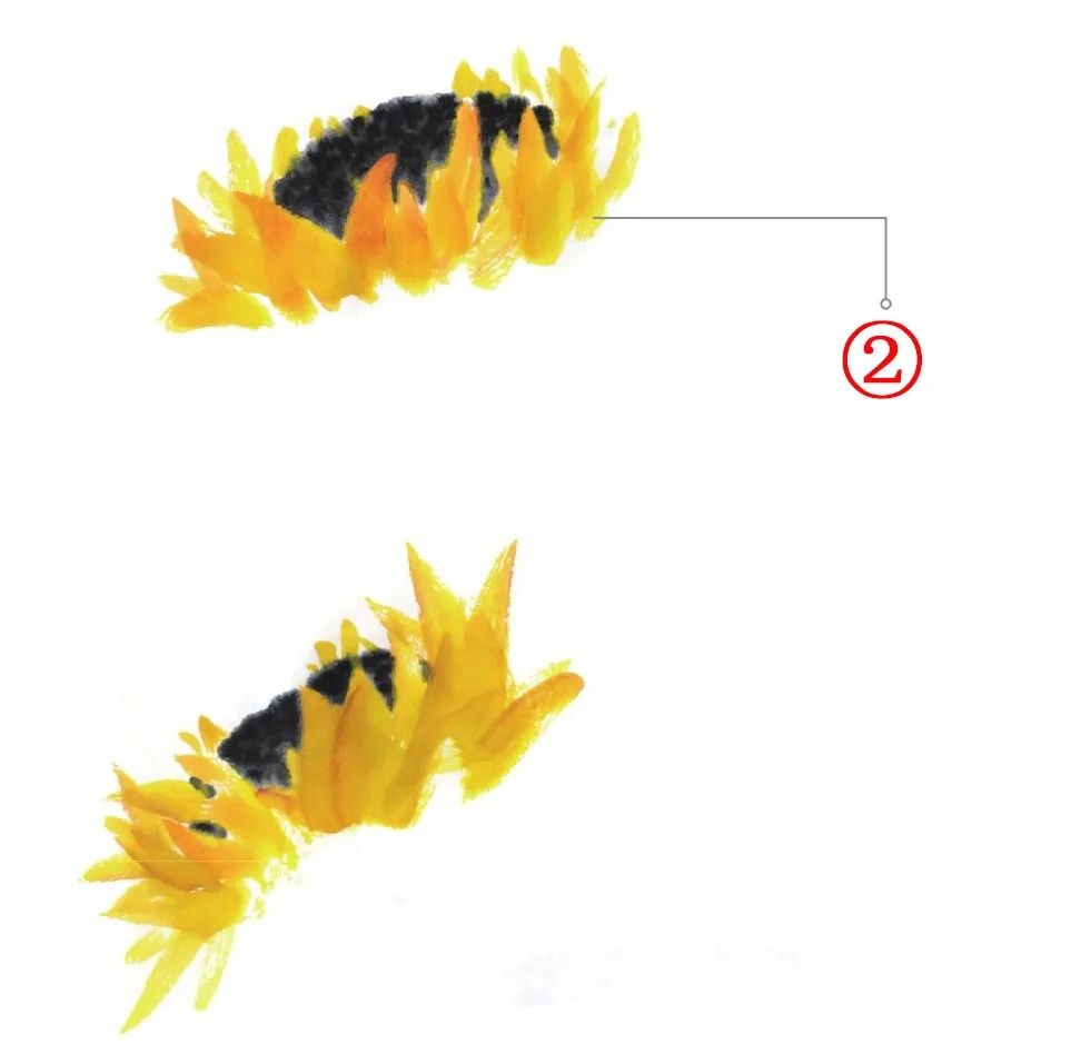 ①微微调淡藤黄,笔尖可略浓重些,绘制分散的向日葵花瓣。↓↓↓