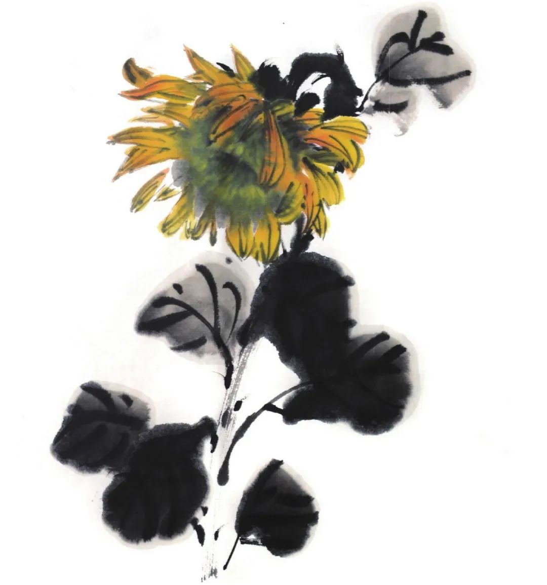 ②先调淡墨色绘制花盘的中央,而后用笔尖蘸重置添画细节。↓↓↓