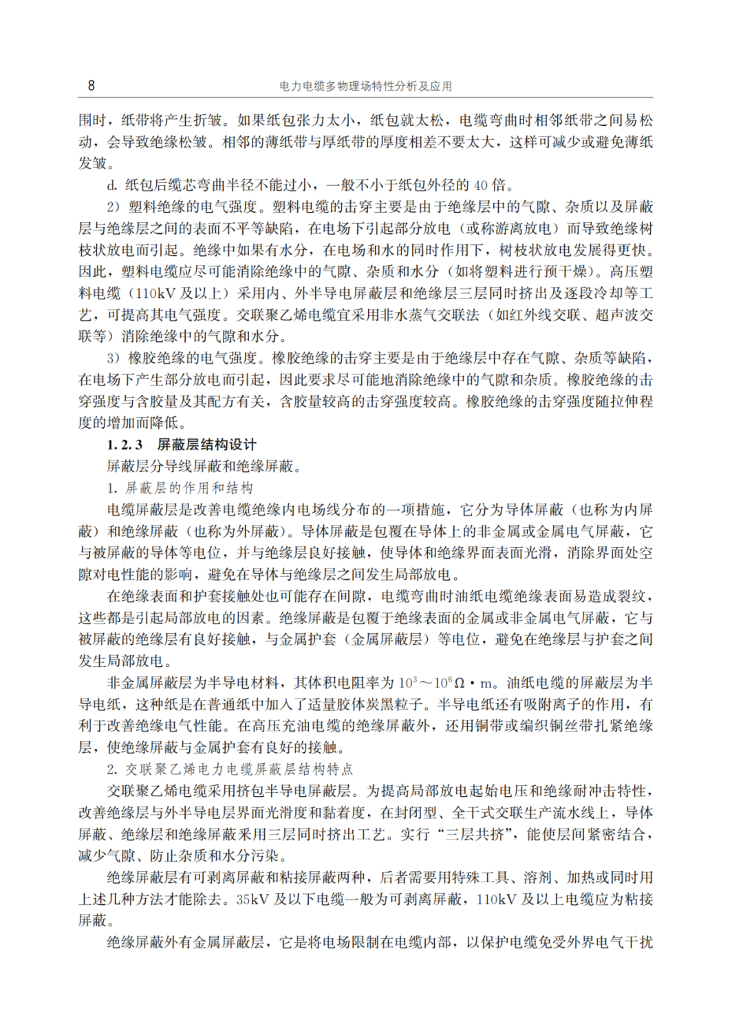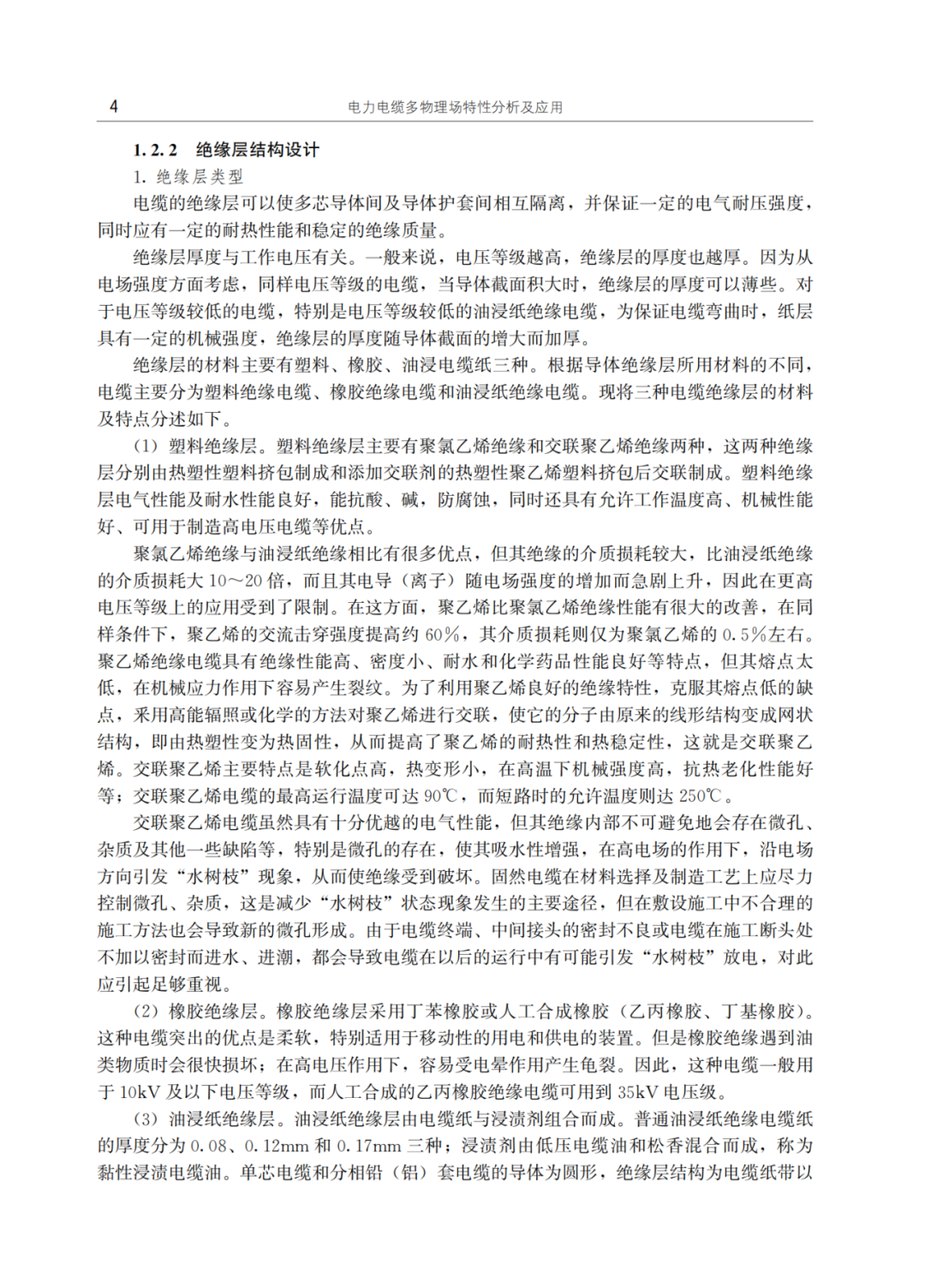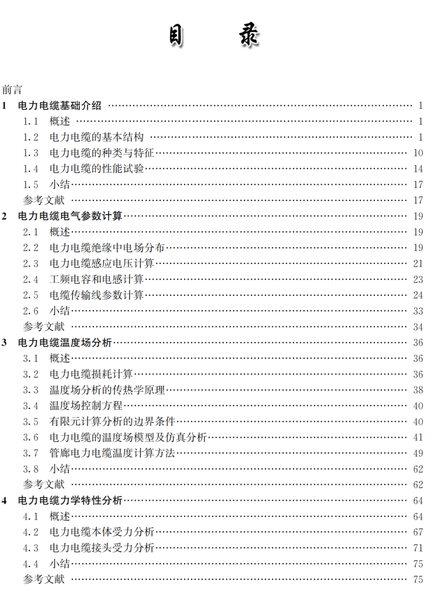 本书从电力电力电缆运行工况中的多物理因素入手,详细分析了电力电缆运行中的电、热、力特性以及基于多元信息融合的电力电缆故障诊断技术。第一章介绍了电力电缆基础知识,第二章说明了电力电缆电气参数及其计算方法,第三章和第四章分别阐述了电力电缆的运行中的温度和力学特性,第五章分析了热力因素影响下的电力电缆绝缘缺陷发展规律,第六章提出了多元信息的电力电缆故障诊断方法。