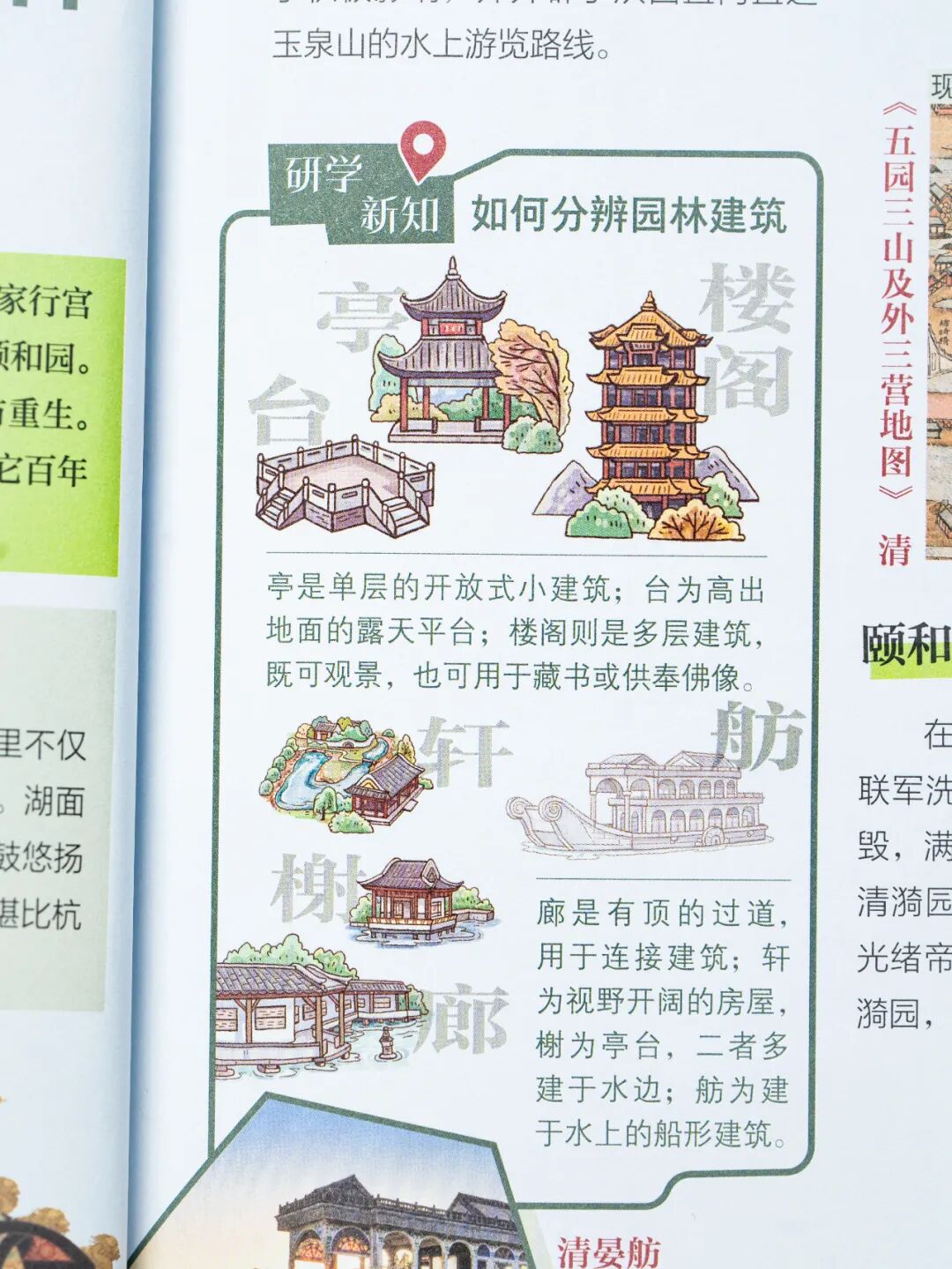 游玩北京颐和园,教孩子如何分辨园林建筑中的亭台楼阁、轩榭廊坊。