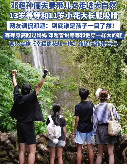 孙俪邓超夫妻俩,带着儿子等等、女儿小花走进大自然,森林徒步、瀑布观景,温馨又松弛。