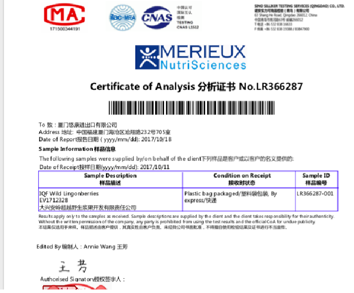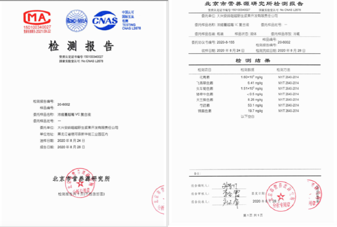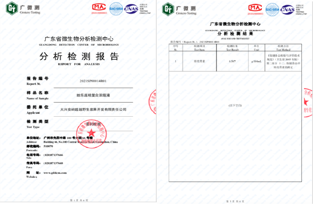 (1)检测报告花青素含量:160mg/100g