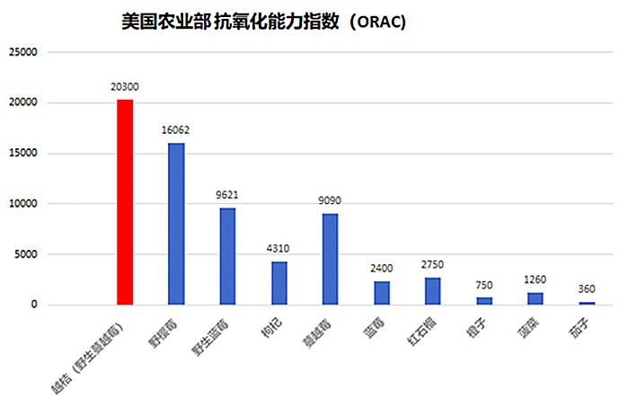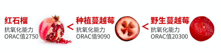 ORAC值,野生蔓越莓是红石榴的约7倍。越桔相比蔓越莓、红石榴、枸杞的ORAC值更出彩!