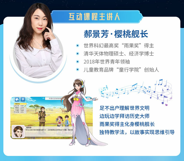 我再看看课程的主创是谁。原来课程主讲人还挺有背景。郝景芳,世界科幻雨果奖获得者。怪不得整套课程有科幻故事感,一上来就是外星人、神器和太空飞船,让小孩子喜欢得不要不要的。“闪光号!时空穿梭!”小孩看完就会背了。课程也挺有故事感,有台词一引导,讲什么知识都显得挺有意思。