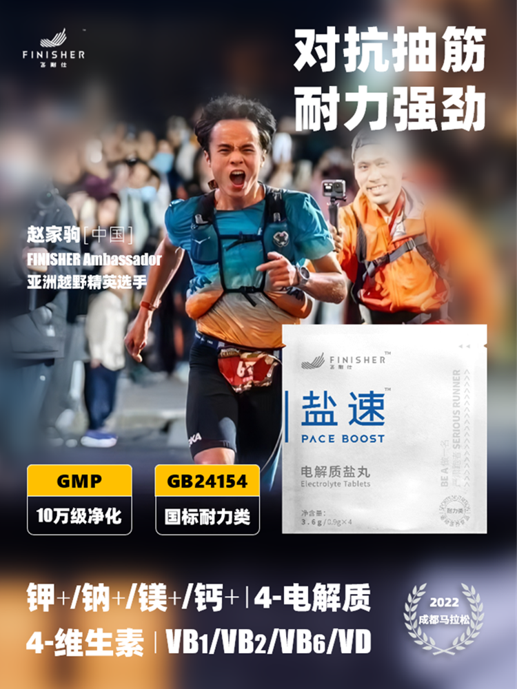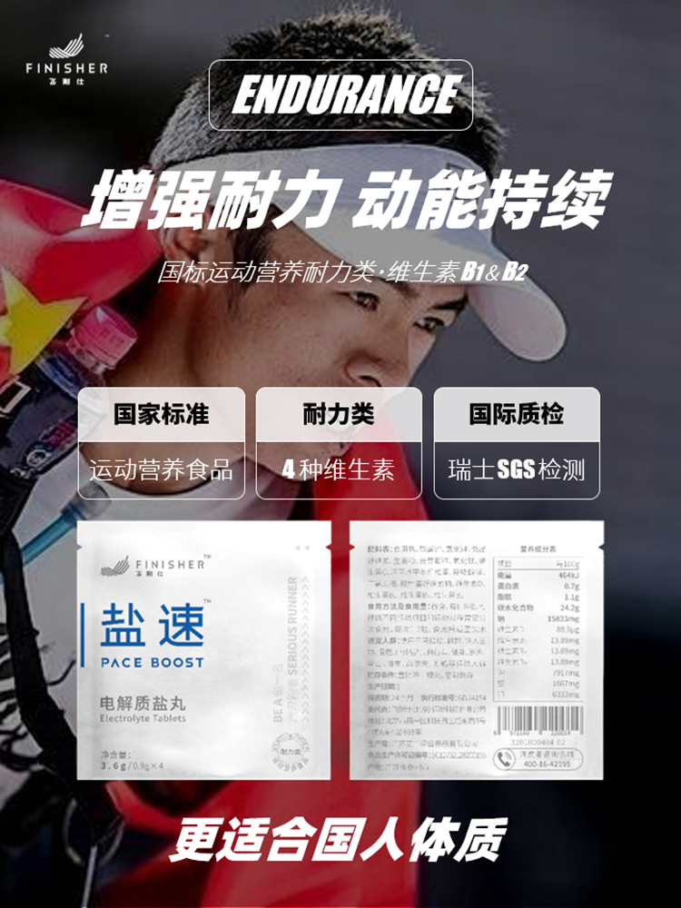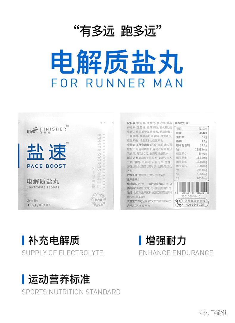 A13:在GB 24154中国运动营养食品安全规范中,对于耐力类产品有明确的定义即要增加维生素B1/B2/B6等。飞耐仕盐速系列电解质盐丸完全按照GB 24154来严格控制配方,是国内达到运动营养食品耐力类的电解质盐丸产品。 简单的说明,希望对跑友们有些许帮助,能够对电解质盐丸有更全面的认知,希望大家运动时,除了运动成绩、运动装备、更应当回归到运动健康的本质上来,更加科学的奔跑。