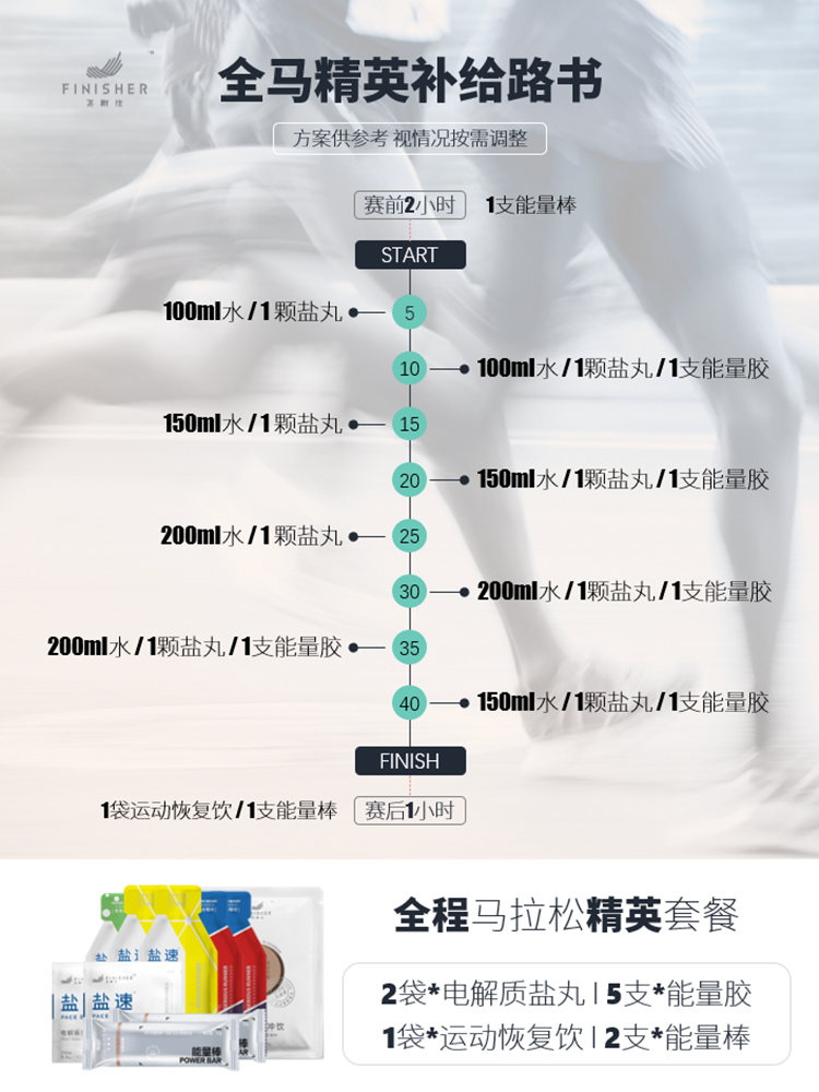 A5:根据经验值建议在马拉松赛前15~30分钟可以服用1粒,在起跑后10公里起,每5~10公里服用1粒,根据自身的出汗量、运动能力、温湿度环境条件、颗粒大小及含量。同时,盐丸不是随意而吃,要参考结合赛道补水点的定点距离位置,在赛前制定好补充计划。
