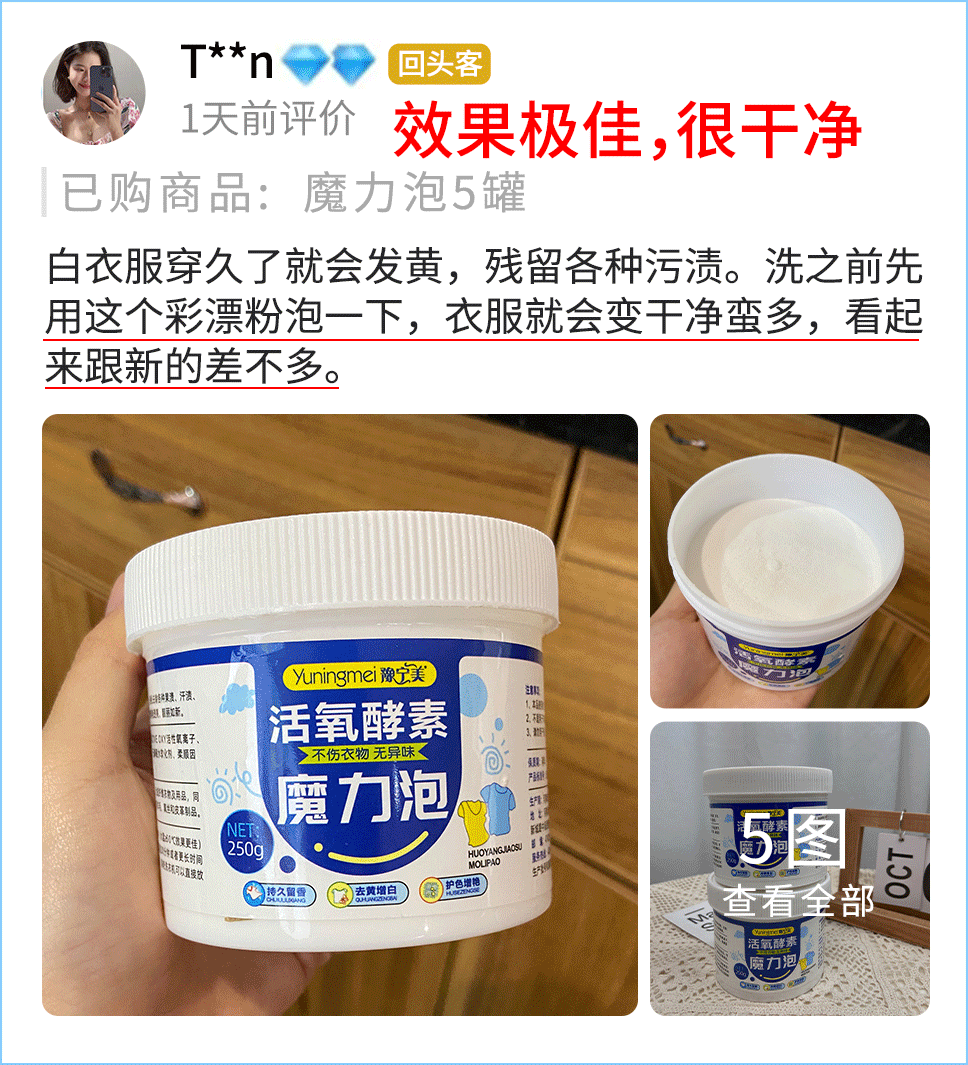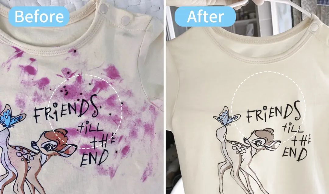 娃儿以前染上火龙果的衣服一般都丢了,怎么搓洗都有印子,这次竟然泡一下就干净了,简直太好用了!