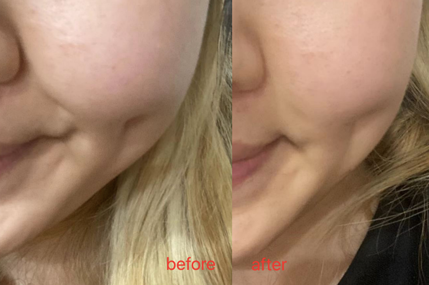 面部咬肌处有向上提拉的感觉,不松垮了,脸小了一圈,下颌侧面提升也很明显,难怪刚刚说下颌有勒的感觉。鼻翼两侧的法令纹效果最明显。肤质不泛黄,还变的透亮了,肌肤像喝足了营养液一样,不知道是不是面膜真的在脸上贴的很紧的缘故,干纹直接一次就有被抚平。