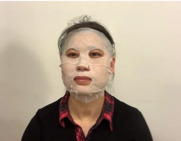李阿姨带上这个面膜的效果是这个样子,把整个头都包住了,阿姨说从来没有用过这种面膜,全方位都能照顾到。