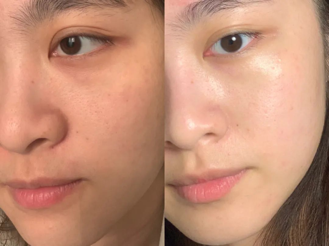 大约20分钟,取下面膜后,轻轻按摩剩余精华至吸收,给你们看仅一次的使用对比图,很惊人!