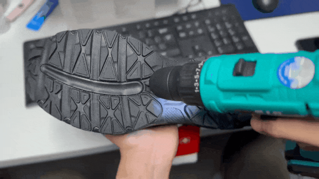 ▶ 小编直接用冲击钻对着鞋底猛攻,鞋底也丝毫无损伤!