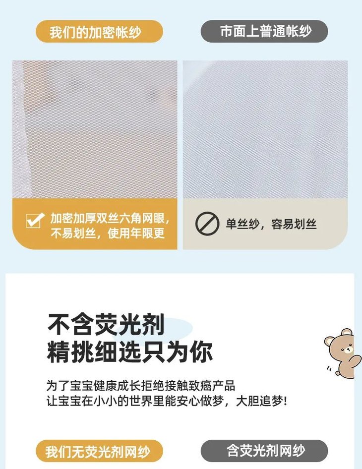 高于国标2倍多,孩子在蚊帐内可以肆意玩耍,不用担心推动蚊帐网纱变形。