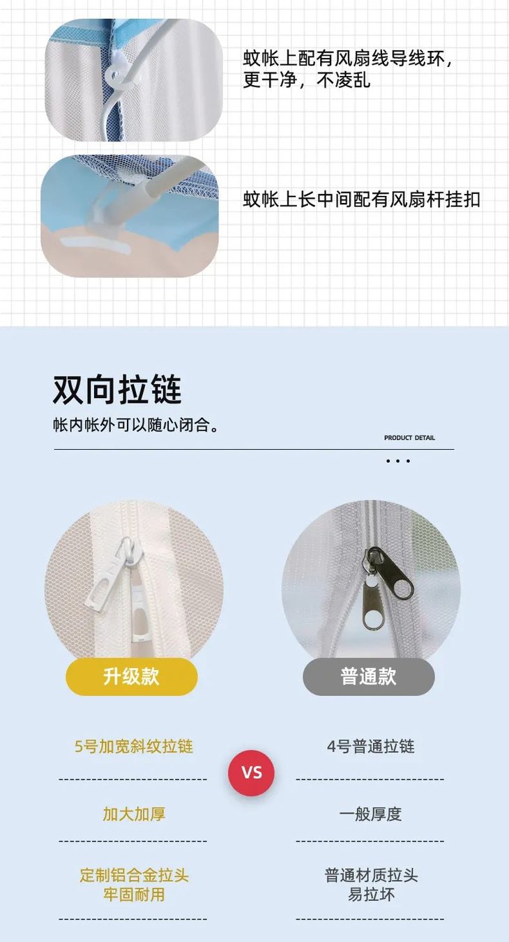 蚊帐网布采用的是加密且坚韧的六角网纱,防蚊的同时还能透气,隔绝其他小飞虫。