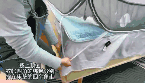 蚊帐的四个角都带有绑带,将它分别扣在床垫的四个角上,这样蚊帐在床上会更牢固。