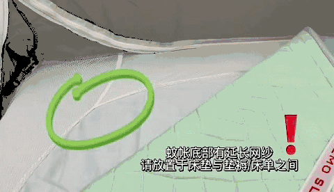 蚊帐底部有延长的网纱,把这些网纱塞在床垫和床单/凉席之间压住,一个完美的蚊帐就好了!