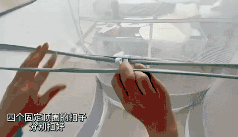 第二步:在蚊帐的顶端安装上顶圈,它能让蚊帐更加的稳固,立挺。