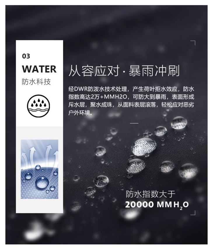 采用3层科技复合面料,强硬应对各种户外挑战。外层防泼水防风材质,中间防水透气膜,底层复合摇粒绒,实现软壳裤的高耐磨性、高抗油污性、高防水与保暖性能的结合,有效抵御户外恶劣天气。