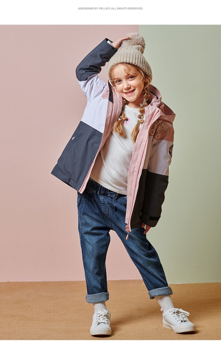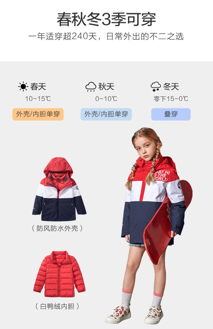 儿童三合一羽绒冲锋衣是相当实用的一个选择。它四季可穿,两件套可拆卸,质地柔软,不束缚够舒适。儿童专用科技面料,采用美国进口涂层面料,表面拒水,不沾水分,让孩子户外玩耍不受风吹雨打!