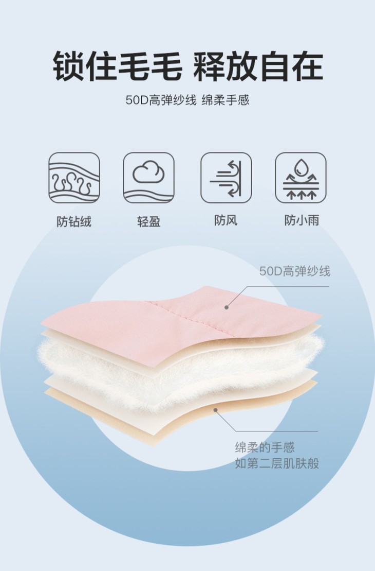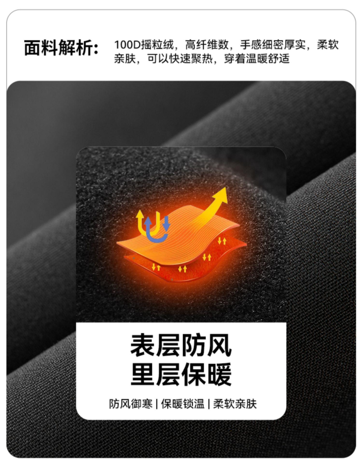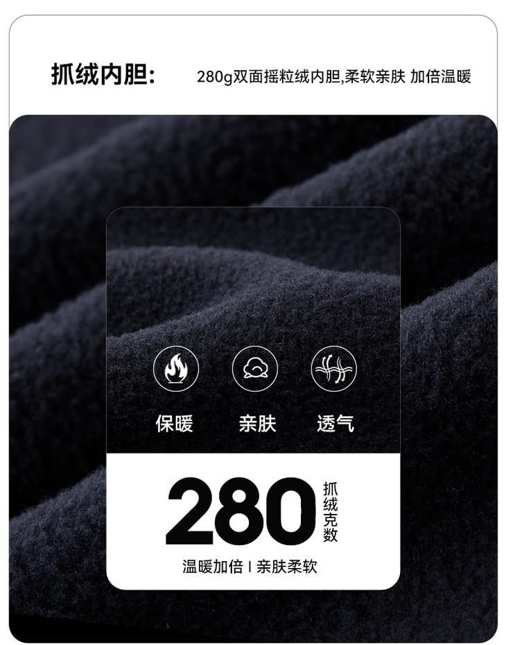 内里采用高品质摇粒绒,手感细密厚实,亲肤舒适,绒粒纤维数高,轻量蓬松,快速聚热不散失,达到持久锁温的效果,让你被温暖舒适包围。