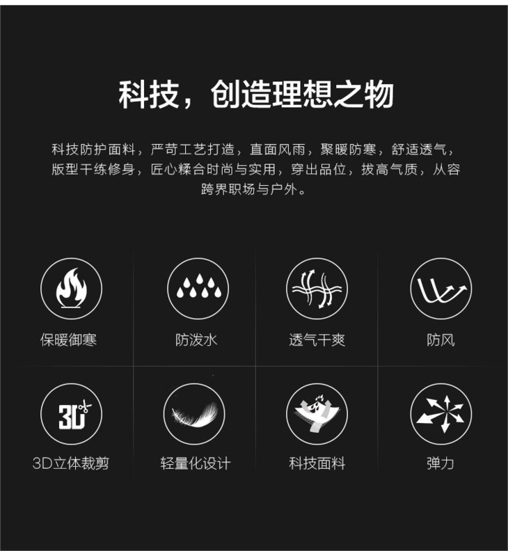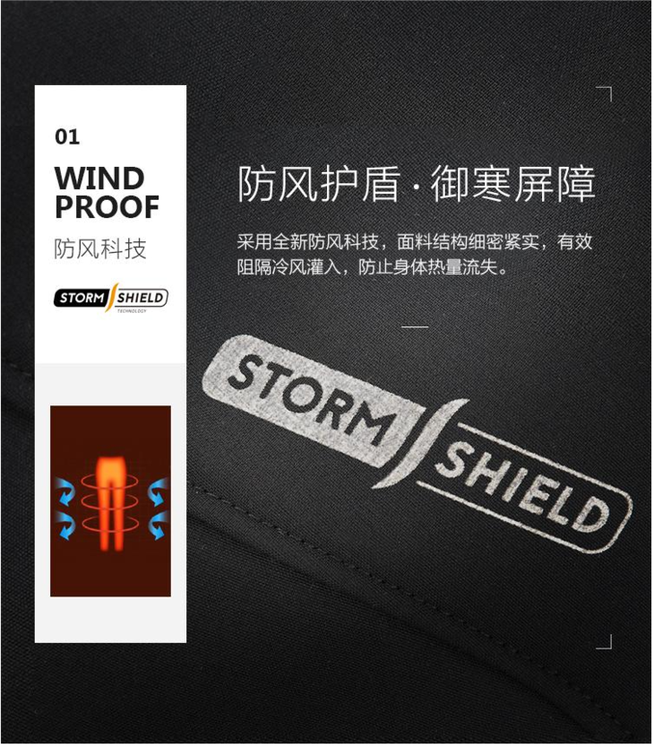防风科技,打造防风护盾,软实力真功夫。科技防风面料,结构致密紧实,形成一个抗风护盾,有效阻隔冷风灌入,防止身体热量流失。透气干爽,让身体自由呼吸。面料透气排湿性能出色,摆脱闷热感,在寒冬里也可自在活动,身体保持舒适干爽。