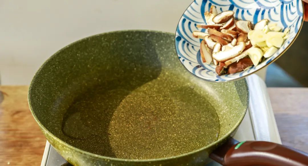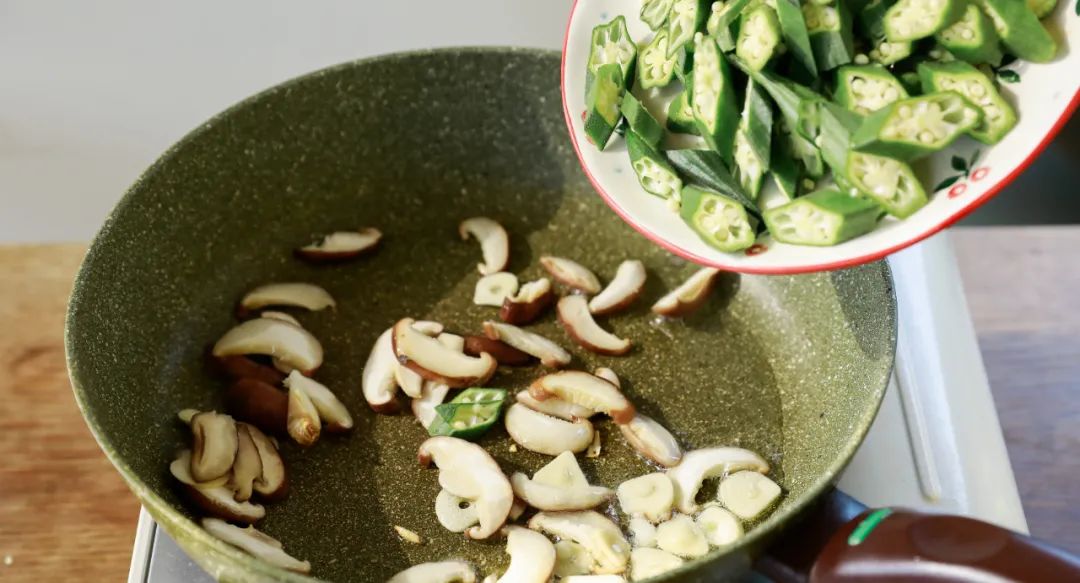 2.炒秋葵:锅预热后倒油,先炒蒜片和香菇。