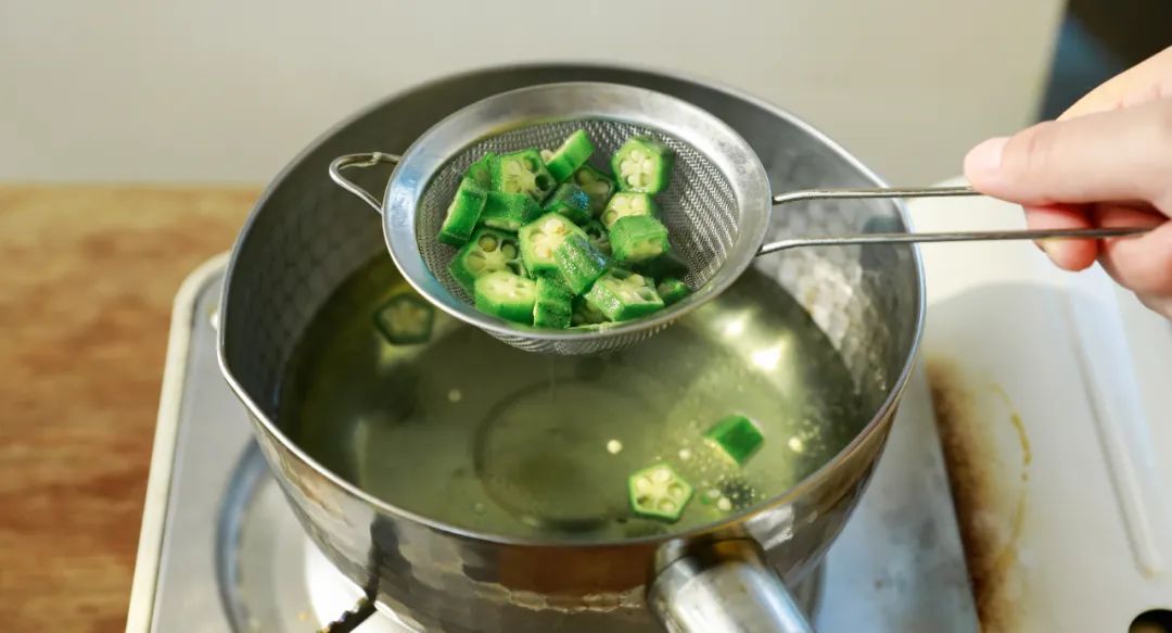 2.焯秋葵:煮一锅开水,放入适量盐和几滴油,将秋葵焯一下水,半分钟到1分钟就可以关火,然后捞出秋葵沥干。 >> 喜欢黏黏的口感的可以先焯水再切,可以减少营养流失。